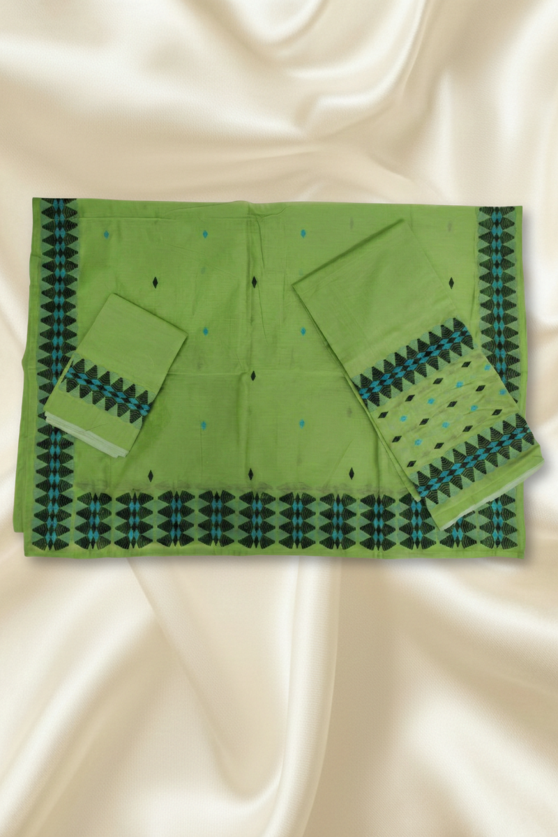 This graceful Mekhela Chador features a refreshing green base highlighted with intricate deep blue floral and vine embroidery. The detailed threadwork spreads elegantly across the fabric, creating a striking contrast while maintaining a balanced, refined look. Finished with clean borders and a soft, fluid drape, this ensemble reflects authentic craftsmanship and is ideal for festive occasions, cultural gatherings, or elegant day wear.
