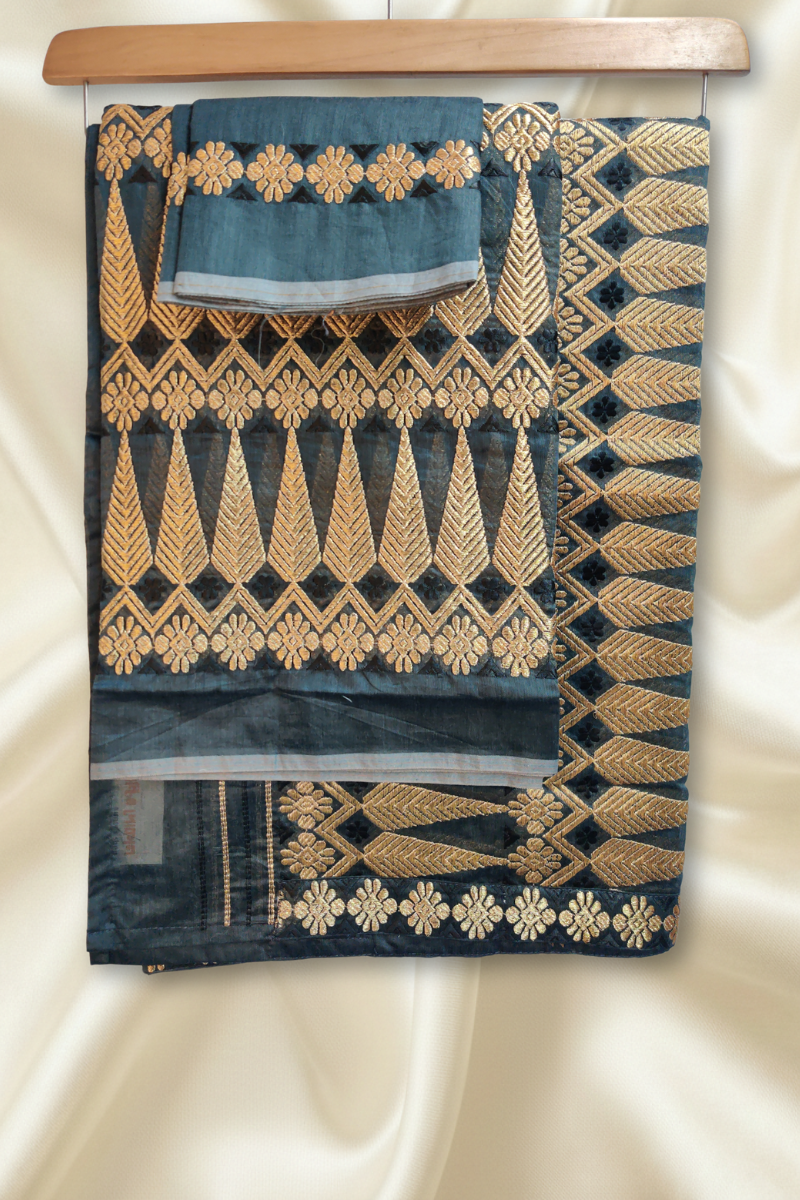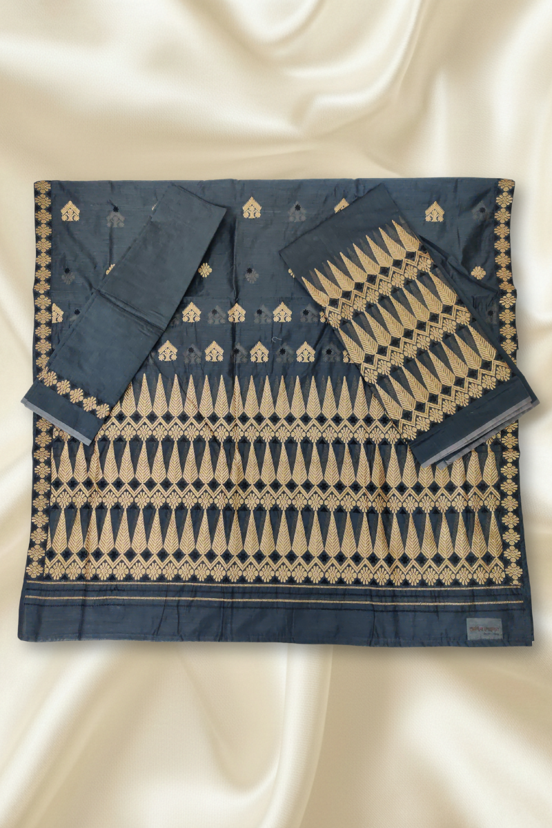Experience the regal essence of Assam with these exquisite Mekhela Chadors, available in deep Imperial Maroon and sophisticated Slate Grey. Each unstitched ensemble is defined by opulent golden Guna (zari) work, featuring striking geometric arrowhead patterns and intricate floral borders. While the maroon set is beautifully accented with vibrant red floral motifs, the slate grey variant offers a bold, high-contrast aesthetic—both crafted with a luxurious silken luster and a graceful drape perfect for weddings and grand festive celebrations.