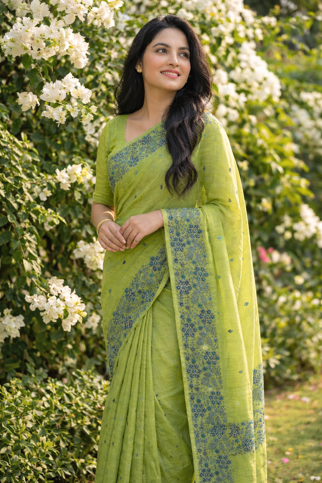 This graceful Mekhla Chador features a refreshing green base highlighted with intricate deep blue floral and vine embroidery. The detailed threadwork spreads elegantly across the fabric, creating a striking contrast while maintaining a balanced, refined look. Finished with clean borders and a soft, fluid drape, this ensemble reflects authentic craftsmanship and is ideal for festive occasions, cultural gatherings, or elegant day wear.