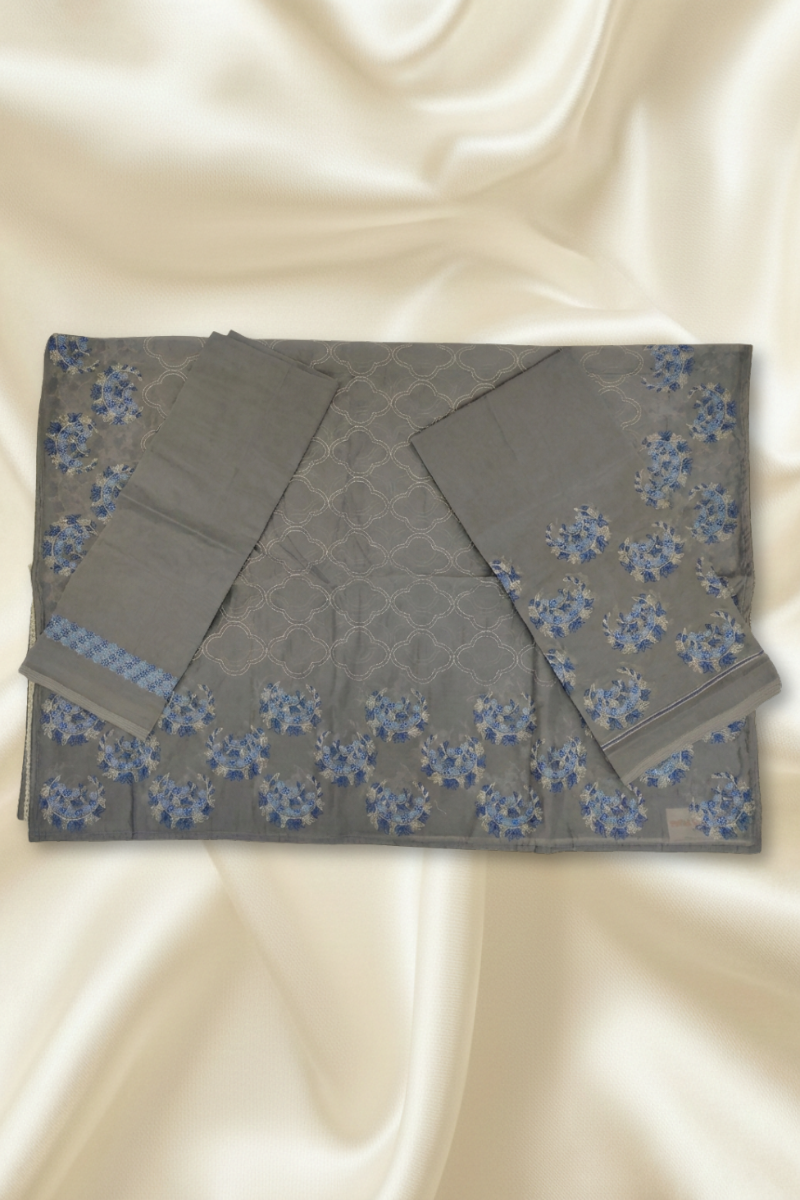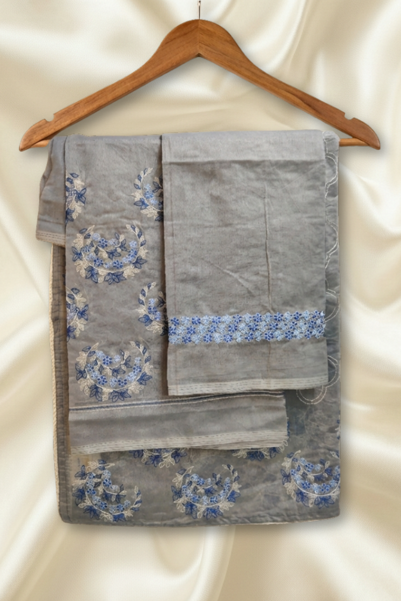 Experience the perfect blend of Assamese heritage and modern elegance with this Chanderi Cotton Mekhela Sador. Set against a sophisticated slate-grey backdrop, the ensemble features intricate floral embroidery in vibrant azure blue and crisp white, complemented by a subtle geometric self-pattern. Lightweight, breathable, and boasting a gentle sheen, this stunning two-piece drape offers a refined look for festive occasions and formal gatherings alike.