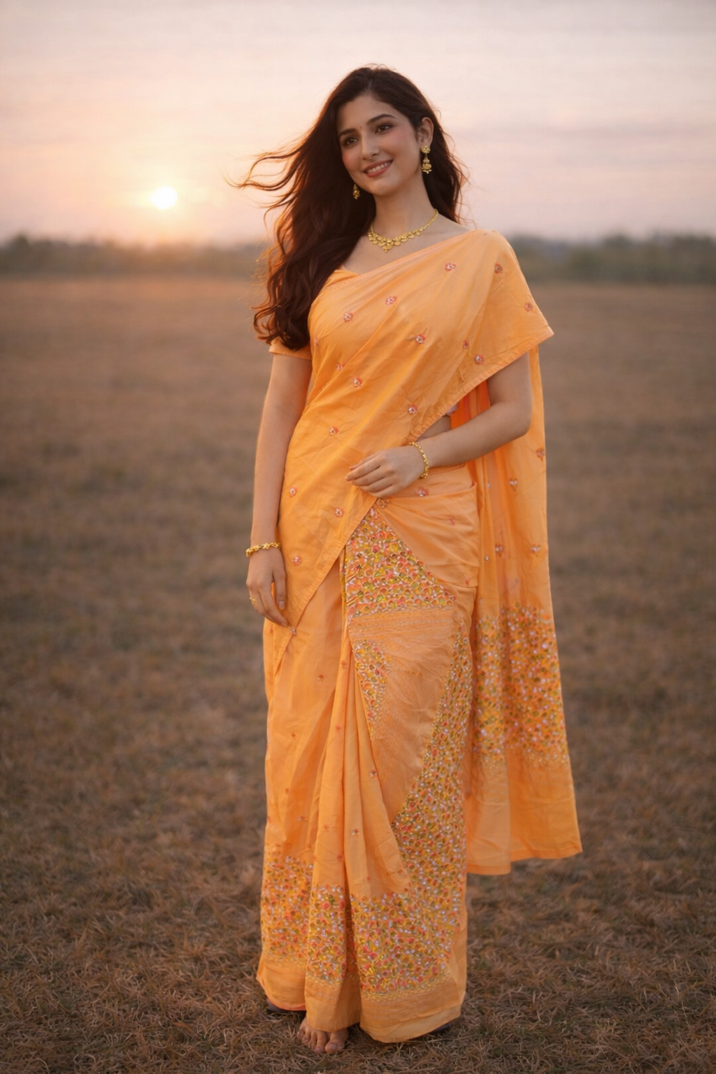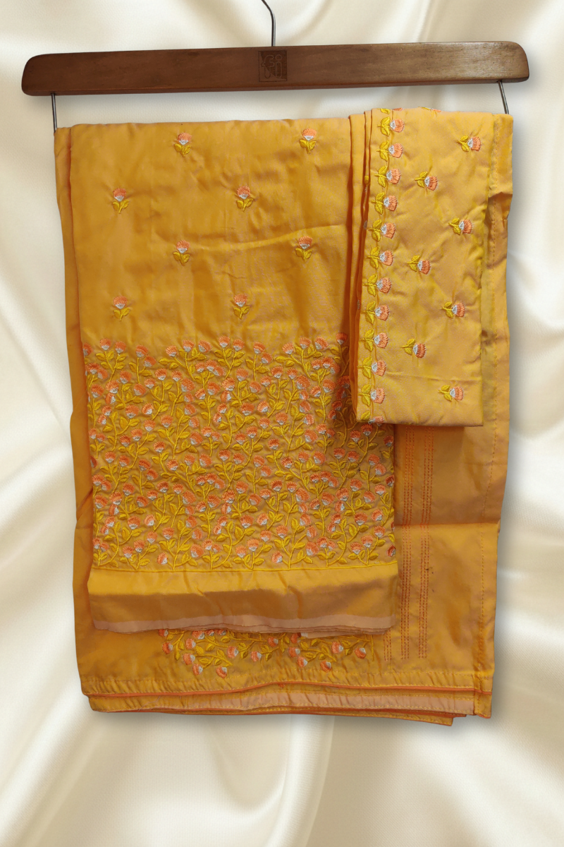 This elegant Mekhela Chador set is crafted in vibrant mustard yellow and soft blush pink tones, beautifully highlighting its delicate floral embroidery. The fabric features finely stitched motifs and graceful vine patterns along the borders, adding depth and charm without overpowering the look. Subtle threadwork and clean finishing enhance its refined appeal, making this ensemble a perfect choice for festive occasions, cultural gatherings, and graceful everyday elegance.