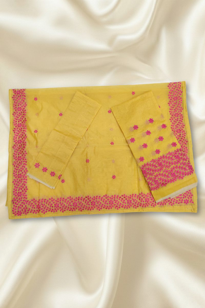 This bright mustard-yellow Mekhla Chador features a cheerful base beautifully highlighted with delicate floral embroidery in vibrant pink tones. The intricately crafted leafy border frames the fabric gracefully, while the scattered floral motifs add a soft, elegant touch. Fresh, lively, and graceful, this ensemble is perfect for festive occasions, daytime celebrations, and elegant traditional wear.